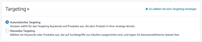 • Automatische Kampagnen: Hier übernimmt Amazon das Targeting für dich, basierend auf relevanten Suchanfragen und ähnlichen Produkten. Diese Art von Kampagne ist ideal, um neue Keywords zu entdecken, auf die du während deiner Keyword-Recherche vielleicht noch nicht gekommen bist. Wenn du beispielsweise Sportbekleidung verkaufst, könnte Amazon automatisch Keywords wie „Fitnessbekleidung“ oder „Trainingskleidung“ hinzufügen. Automatische Kampagnen sind besonders nützlich, um zu identifizieren, welche Suchbegriffe für deine Produkte am besten funktionieren und wo du dein Werbebudget gezielt einsetzen solltest. Sie helfen dir, wertvolle Erkenntnisse über deine Zielgruppe zu gewinnen, die dir später bei der Verfeinerung deiner Marketingstrategie zugutekommen können.