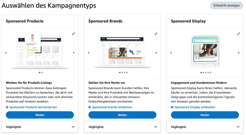 Amazon unterscheidet zwischen verschiedenen Kampagnenarten wie Sponsored Products, Sponsored Brands und Sponsored Display Ads.